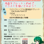 液晶タブレット、またはiPadで、デジタルイラストを描いてみよう!初心者、お子様、年配の方も大歓迎です。アナログ画材(ペン、マーカー、色鉛筆)も用意しています。 開催日時 開催日:2026/1/25(日)時 間:13:00 ~ 16:30(最終受付16:00) 開...